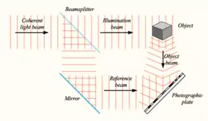 0چون تابش لیزر منظم یعنی تکرنگ و همدوس است. جزئیات صحنهای که چنین نوری بر آن میتابد، با دقت تمام روی فیلم عکاسی منتقل میشود. موجی که از بخشهای دورتر صحنه به فیلم میتابد نسبت به موج مربوط به بخشهای نزدیکتر صحنه تأخیر خواهد داشت. همین امر روی فیلم ثبت میشود. برای ثبت یک باریکه مبنا (reference beam) مورد نیاز خواهد بود تا روابط فازی باریکه ما با هم مقایسه شوند. این کار با تقسیم کردن پرتو لیزر به دو بخش به دست میآید. بخشی از باریکه به سمت صفحه مورد نظر هدفگیری میشود و باریکه منعکس شده از صفحه با بخش دیگری از باریکه که مستقیماً به فیلم عکاسی میتابد، مقایسه میشود. پرتوهای تابشی در محلی که به هم میرسند با هم تداخل خواهند کرد.