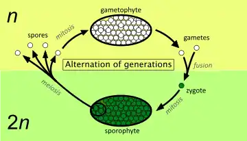 دیاگرام نشاندهنده جایگزینی نسلها بین یک diploid sporophyte (پایین) و یک haploid gametophyte (بالا)
