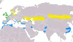 | پراکندگی بومی (زرد: تابستان، آبی: زمستان، سبز: تمام سال) | |