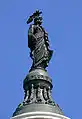کلاهخودی به سر دارد که حاوی ستاره و به شکل سر عقاب سر سفید است. وی بر روی یک کره ایستادهاست که بر روی آن عبارت E Pluribus Unum نقش بسته است. این واژه یکی از شعارهای ملی آمریکا است و به معنای «واحدی متشکل از تعدد» است که اشاره به به وجود آمدن ایالات متحده از چندین ایالت به صورت یک کشور واحد دارد.
