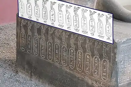 در متون میخی سه زبانه چنین آمدهاست: «این همان تندیس سنگی است که داریوش شاه دستور داد در مصر بسازند تا هر کس در آینده آن را ببیند، بداند که ایرانیان مالک مصرند.»[6] ژان یویوت بر اساس این ارزیابی که مرمر این تندیس از کوههای زاگرس استخراج شدهاست، این نظر را مطرح کرده که این تندیس نمونهای از اصل آن بهشمار میرود که در برابر معبد اَتوم در هلیوپولیس نصب شده بودهاست.[7]
