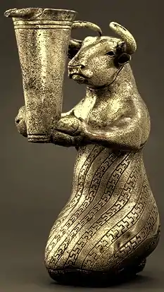 مجسمه گاو عیلامی با لباسی منقوش به طرح پلکانی و جام دهانه داری که در دست دارد، آمیختگی جالبی از ویژگیهای انسان و حیوان را نمایش میدهد. البته این گونه نمایش ترکیبی (حیوان در نقش انسان) در دوره عیلامی مقدم معمول بوده و احتمالاً نشان نوعی قدرت فوق طبیعی بوده که از طرف خدایان به پادشاهان اعطا میشدهاست. با اینکه کاربرد این تندیس کاملاً مشخص نشدهاست، نوع جام و طرحهای حک شده روی لباس، بیانگر نوعی مراسم آیینی یا جشن مذهبی است. همچنین جنس نقرهای این مجسمه معروف که در عصر مس (حدود ۵۰۰۰ سال پیش) ساخته شده، علاوه بر هنرمندی قابل ستایش سازندگان آن، بیانگر پیشگامی تمدن عیلام در فناوری استخراج و ذوب فلزات گرانبها است.