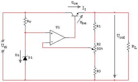 گرچه استفاده از تنظیمکنندههای ولتاژ ساده در بسیاری از سیستمهای الکترونیکی ارزانقیمت متداول است، ولی در منابع تغذیه تجاری، تنظیم ولتاژ بهتر و دقیقتر و نیز ولتاژ خروجی قابل تغییر مورد نیاز است. توسط دیود زنر ولتاژ مرجعی تولید میشود و تقویت کننده خطا که معمولا یک آپاَمپ است، این ولتاژ را با ولتاژ خروجی که از تقسیمکننده ولتاژ مقاومتی R2, R1 و R3 بدست میآید، تفاضلکرده (ازهم کم میکند) و مقدار خطای حاصل شده را جهت تنظیم ولتاژ خروجی به بیس ترانزیستور اعمال میکند.