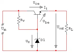 در شکل زیر مدار تنظیمکننده ترانزیستوری سری دیده میشود. عیب عمده این مدار عدم حفاظت در برابر اتصال کوتاه و راندمان پایین به علت تلفات DC در قطعات الکترونیکی که عمده آن مربوط به ترانزیستور سری است، میباشد.