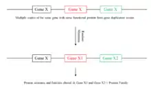 در سالهای اخیر، در رابطه با احتمال وجود ارتباط میان ژنهای همخانواده و تنوع تعداد تکرارها بحثهایی شدهاست. ژنهای همخانواده، مجموعهای از ژنهای مرتبط هستند که دارای عملکردهای مشابه و اختلافهای زمانی یا فضایی جزئی هستند و به احتمال زیاد از یک ژن اجدادی مشترک حال شدهاند. اصلیترین انگیزه برای وجود ارتباط میان تنوع تعداد تکرار و این مفهوم این است که به احتمال زیاد ژنهای یک خانواده از یک ژن اجدادی که در نسخههای مختلف کپی شدهاست، به وجود آمدهاند. جهشها در طول زمان بر روی ژنها ایجاد میشوند و آن دسته از ژنهایی که با طبیعت سازگار هستند در اثر انتخاب طبیعی باقیمانده و خانوادهای از ژنها را ایجاد میکنند. یک نمونه از خانواده ژنی که ممکن است به دلیل تنوع تعداد تکرار ایجاد شده باشد، خانواده گلوبین است. خانواده گلوبین یک شبکه دقیق از ژنهای متشکل از ژنهای آلفا و بتا گلوبین است که شامل ژنهایی هستند که در جنینها و بزرگسالان بیان میشوند. ژنهای گلوبین در خانواده گلوبین به خوبی ویژگیهای مشترک خود را حفظ کردهاند و تنها در بخش کوچکی متفاوت هستند که نشاندهندهٔ این نکته است که از یک جد مشترک به دست آمدهاند.