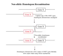 یکی از شناختهشدهترین تئوریهایی که منجر به تنوع تعداد تکرار، درج و حذف میشود، نوترکیبهای همسان غیر آللی است.[9] در طی بازسازی میتونی، کروموزمهای همسان یک سری کروموزومهای جفت با نقاط اتصال خاصی را تشکیل میدهند. با این حال، در طی یک مکانیزم ناپایدار، در طول شکلگیری این نقاط اتصال، گپ دو رشتهای به صورت منظم و ر موقعیتهای غیر آللی وجود دارد. سپس با امکانسازی عبور مواد شیمیایی میان دو کروموزوم یکسان قسمتی از ژنوم در این دو کروموزم همسان تکرار میشود. به همین دلیل، نواحی با تکرار بیشتر و مجزا، نواحی هستند که به صورت مستقل تکرار شدهاند. نوع دیگری از مکانیزم نوترکیبسازی همسان که میتواند منجر به تغییر در تعداد تکرار شود، تکرار ناشی از شکست نام دارد. هنگامی که یک شکست دوگانه در ژنوم اتفاق میافتد، سلول بهطور غیرمنتظره مسیرهایی را که بین این شکستها دچار اختلال شدهاند را فعال میکند. اشتباهات در تعمیر شکاف مانند نوترکیبسازی هلیوژنتیک غیر آللها، میتواند منجر به افزایش تعداد تکرارهای یک منطقه خاص از ژنوم شود. در طول تعمیر شکست دو رشته، انتهای شکسته میتواند به جای بازگشت به رشته اصلی به کروموزوم همولوگ آن حمله کند. همانند مکانیزم نوترکیبسازی همسان، یک نمونه اضافه به ناحیهٔ خاصی از کروموزوم انتقال مییابد که منجر به بروز تکرار میشود. به علاوه، پروتئینهای کوهسین به بازسازی شکستگیهای دوگانه با بستن دو طرف آن و جلوگیری از نفوذ به سایر نقاط کروموزوم، کمک میکنند. اگر به هر دلیلی مانند فعال شدن RNA ریبوزومی عملکرد کوهسین تحت تأثیر قرار بگیرد، یک افزایش در بازسازی خطا به صورت محلی ممکن است صورت گیرد.[10]
