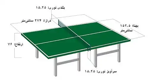 سطح روی میز که سطح بازی نامیده میشود، باید به صورت مستطیل بوده طول آن ۲/۷۴ متر و عرض آن ۱/۵۲۵ متر باشد. این میز که در سطح افقی قرار میگیرد باید ۷۶ سانتیمتر از زمین ارتفاع داشته باشد. سطح مؤثر بازی کنارههای عمودی میز را در برنخواهد گرفت.[10][11] سطح بازی میتواند از هر جنسی ساخته شود با این شرط که وقتی یک توپ استاندارد در هر قسمت میز از ارتفاع ۳۰ سانتیمتری رها شود به اندازه ۲۳ سانتیمتر به سمت بالا جهش داشته باشد. سطح بازی باید دارای رنگی یکنواخت به صورت تیره و مات و بدون و بازتاب نور باشد و خط سفید کناری به عرض ۲ سانتیمتر در امتداد طول (لبهٔ ۲/۷۴ متری) و خط سفید انتهایی به عرض ۲ سانتیمتر در امتداد عرض (لبه ۱/۵۲۵ متری) کشیده میشود. سطح بازی به وسیله یک تور عمودی به دو قسمت مساوی تقسیم میشود. این تور موازی با خطوط انتهایی و بهطور یکنواخت از یک طرف میز به طرف دیگر آن کشیده میشود. در بازیهای دو نفره، هر زمین به وسیلهٔ یک خط میانی سفید رنگ به عرض ۳ میلیمتر به دو قسمت مساوی به نام «نیم زمین» تقسیم میشود. این خط میانی به موازات خطوط کناری کشیده خواهد شد و باید جزئی از نیم زمین سمت راست محسوب شود.[12]