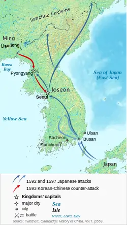 در سال ۱۵۹۲ تویوتومی هیدهیوشی به کره حمله برد تا پیشدرآمدی برای هجوم به چین باشد. بنا بر فرضیهها، دلایل بسیاری برای حملهٔ ژاپن به کره ذکر شدهاست. گفته میشود که هیدهیوشی برای تحقق رؤیاهای ارباب فقید خود، اودا نوبوناگا برنامهٔ هجوم به چین را ریختهاست. همچنین وی تلاش داشت تا با یک درگیری خارجی، از شورش داخلی و شورش ساموراییهایی که بعد از پایان جنگ داخلی بیکار شده بودند، در ژاپن جلوگیری کند. درگیری خارجی میتوانست دولت تازهشکلگرفتهٔ او را در برابر دشمن مشترک متحد نگه دارد و مانع از این شود که دایمیوها به علت جاهطلبی علیه حکومت هیدهیوشی عمل کنند.