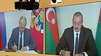 ![]() الهام علی اف و ولادمیر پوتین در حال امضای توافقنامه از طریق ویدئوکنفرانس | |