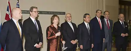 از راست: لوران فابیوس (فرانسه)، سرگی لاوروف (روسیه)، جان کری (آمریکا)، وانگ ئی (چین)، محمدجواد ظریف (ایران)، کاترین اشتون (اتحادیه اروپا)، گیدو وستروله (آلمان) و ویلیام هیگ (بریتانیا)