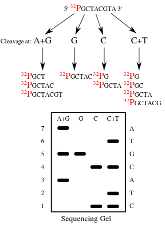 - مرحله پایانش شیمیایی: در این گام چهار نوع آزمایش انجام میشود که این آزمایشها بخشهای کوچکی از دیانای را تولید میکنند. به این ترتیب که رشته میتواند در باز مربوط به آن آزمایش شکسته شود. در آزمایش نوع اول مربوط به گروههای A+G، دوم مربوط به G سوم مربوط به C و چهارم مرتبط به C+Tاست. برای مثال افزودن نمک (کلرید سدیم) به واکنش هیدرازین سبب مهار واکنش تیمین برای واکنش C میشود، پورین (A+G) با استفاده از اسید فرمیک پورین زدایی میشود، گوانین (و تا حدی آدنین) توسط دی متیل سولفات متیله میشود و پیرامیدین (C+T) با استفاده از هیدرازین هیدرولیز میشود. در نتیجه مجموعهای از برچسب قطعات تولید شده از پایان برچسب گذاری شده رادیواکتیوی تا اولین برش در هر مولکول تولید میشود.