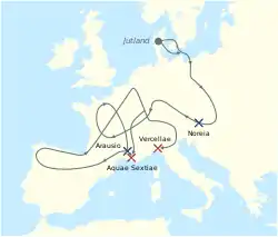 بیشتر از یک سده پیش از زایش مسیح بسیاری از توتنها و تبارهای کیمبری به سوی جنوب و باختر دره رود دانوب کوچیدند. جایی که با امپراتوری رومیها روبرو شدند. در سالهای پایانی سده دوم پیش از میلاد گذر توتنها و کیمبریها از میان سرزمین گُلها و یورش آنها به رومیها در ایتالیا نگاشته شدهاست. پس از چندین پیروزی پشت سر هم برای ارتش یورش آورنده ٬کیمبری و توتن ارتشهای خود را از هم جدا کردند و پس از آن جداگانه از گائوس ماریوس سردار رومی در ۱۰۱ و ۱۰۲ سال پیش از میلاد شکست خوردند. پس از شکست توتنها پادشاه آنها به زنجیر کشیده میشود و همه زنان دربند شده آنها خودکشی میکنند. از این رخداد در افسانههای رومی نیز به پاس دلاوری ستودنی آنها بدست ژِروم یاد شدهاست. گفته شده که ۳۰۰ تن از زنان شوهردار توتن که به بردگی رومیها درآمده بودند پس از این که از پذیرش درخواست رومیها سرباز میزنند برای رهایی از دست آنها نخست کودکان کوچک شان را میکشند و سپس در شب با دستهای خود همدیگر را خفه میکنند.