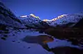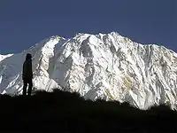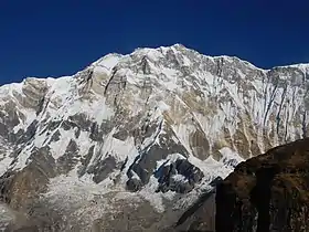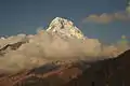 ![]() آناپورنای جنوبی از کمپ اصلی اناپورنا (ارتفاع ۴۱۳۰ متری) قبل از طلوع خورشید | |