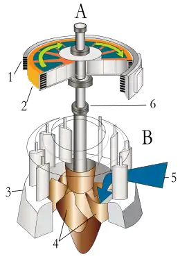 قبل از ضربه زدن به پرههای توربین، فشار آب (انرژی پتانسیل) توسط یک نازل به انرژی جنبشی تبدیل میشود و با تمرکز بر روی توربین شدهاست. تغییر فشار در پرههای توربین رخ میدهد، و توربین مسکن برای عمل نیاز ندارد.
