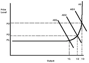 در نظریه کینزی، افزایش اشتغال منجر به افزایش تقاضای کل (AD) میشود که منجر به استخدام بیشتر بنگاهها برای افزایش بازده میشود. به دلیل محدودیت ظرفیت، سرانجام این افزایش تولید به حدی کم میشود که قیمت کالاها افزایش مییابد. در ابتدا، بیکاری کاهش مییابد و AD1 را به AD2 منتقل میکند، که باعث افزایش تقاضا (به عنوان «Y») به وسیله (Y2 - Y1) میشود. این افزایش تقاضا بدان معنی است که تعداد بیشتری کارگر مورد نیاز هستند و پس از آن AD از AD2 به AD3 منتقل میشود، اما این انتقال بسیار کمتر از انتقال قبلیست، اما سطح قیمت از P2 به P3 افزایش یافتهاست، که این افزایش بسیار بیش تر از تغییر قبلیست. این افزایش قیمت را تورم مینامند.