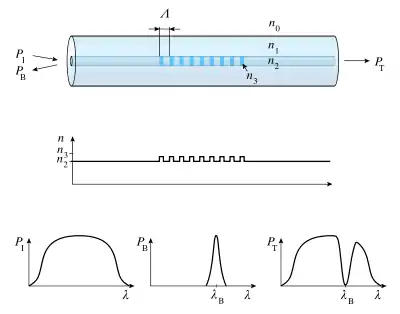 اصل اساسی که در پس FBG نهفته است، بازتاب فرنل است. جایی که نور بین دو محیط با ضریب شکست مختلف در مرز دو محیط هم بازتاب و هم شکست رخ میدهد. ضریب شکست عموماً در یک طول مشخص تغییر میکند. طول موج بازتابی ()که طول موج براگ نامیده میشود، با رابطه زیر به دست میآید: