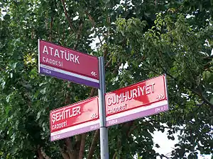 ![]() تابلوی خیابان سهراهی آتاترک، جمهوری و شهیدلَر | |