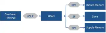 سیستمهای UFAD از یک فضای تأمین زیر کف، واقع در بین دال بتنی سازه و سیستم کف کاذب، برای تهویه هوا از افشانههای کف به ناحیه اشغال شده ساختمان استفاده مینمایند. لایه بندی حرارتی از مشخصات اینگونه سیستمها است که نسبت به سیستمهای هوایی سنتی (OH)، از لحاظ ترموستاتیکی بالاتر است. مشخصات بار سرمایش UFAD متفاوت از سیستم OH سنتی است که به علت تأثیر کف کاذب میباشد. سیستم UFAD دارای پیک بار سرمایشی بالاتر نسبت به OH است. این سیستم مزایای بسیاری نسبت به روشهای سنتی دارا میباشد. این مزایا عبارتند از انعطافپذیری طراحی، ارتقاء حرارت، ارتقاء راندمان و بازده سیستم تهویه، ارتفاء بازده انرژی در آب و هوای مناسب و کاهش هزینههای تعمیرات نگهداری. غالباً از UFAD در ساختمانهای ادرای، مخصوصاً ساختمانهایی که در طول کاربری امکان تغییر پلان وجود دارد استفاده میگردد. UFAD برای انواع ساختمانها از جمله ساختمانهای تجاری، اموزشگاهها، کلیسا، فرودگاه، موزه و کتابخانه و … مناسب است. ساختمانهای مهمی که در آمریکای شمالی از این سیستم استفاده مینمایند شامل ساختمان نیویورک تایمز، بانک برج آمریکا و ساختمان فدرال سانفرانسیسکو هستند.