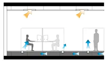 سیستمهای DV دارای اصول یکسان با سیستمهای UFAD هستند. سیستمهای DV هوای سرد را به فضای تهویه مطبوع شده در نزدیکی سطح کف رسانده و مسیر برگشت از سقف است. این با بهرهبرداری از خاصیت طبیعی هوای گرم و حرارت تولید شده با منابع حرارتی محقق میشود. در UFAD ترکیب با هوای ناحیهٔ مورد نظر بیشتر است. تفاوت عمدهٔ این دو روش در این است که در UFAD عرضه هوا از طریق خروجیهای کوچکتر با سرعت بیشتری نسبت به DV انجام میشود و خروجیهای عرضهٔ هوا را معمولاً ساکنان ساختمان کنترل مینمایند.