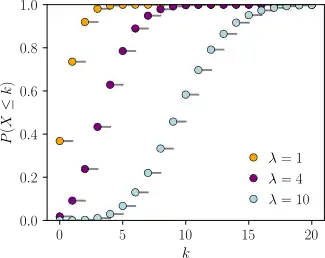 تابع توزیع تجمعی ![]() محور افقی اندیس k است، که معادل تعداد رخداد است. CDF در مقادیر صحیح k غیرپیوسته است، و در بقیه جاها صاف است، زیرا یک متغیر تصادفی که توسط پواسن توزیع شده است، تنها مقادیر صحیح را میپذیرد. | |||