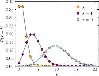 تابع جرم احتمال ![]() محور افقی اندیس k میباشد، که معادل تعداد رخداد است. λ معادل نرخ چشمداشتی برای رخدادها است. محور عمودی احتمال k رخداد موقعی است که λ را از قبل بدانیم. این تابع فقط در مقادیر صحیح k تعریف شدهاست. خطوط متصل کننده تنها به دید بهتر کمک میکنند. | |||