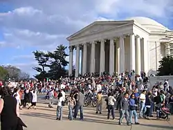بنای یادبود جفرسون در واشینگتن، دی.سی. (راست) مجسمه جفرسون به همراه مقدمه اعلامیه استقلال ایالات متحده آمریکا (چپ) | ||