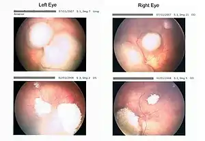 معمولاً تشخیص آن توسط والدین با نگاه کردن به عکسهای یادگاری ممکن میشود. هنگامیکه فلاش دوربین روشن شود٬ در عکس چشمها قرمز هستند. اما مردمک در این بیماری سفید رنگ (لکوکوریا) به نظر میرسد و بازتاب عادی قرمز رنگ در وسط مردمک دیده نمیشود.[3] علامت مهم دیگر درخشش چشم در تاریکی است. در بچهها ممکن است انحراف چشم هم دیده شود.[2]