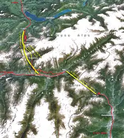 ![]() The Lötschberg Base Tunnel together with the century-old تونل سیمپلون form the western part of the NRLA project (yellow: major tunnels, red: existing main tracks, numbers: year of completion) | |