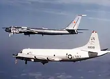 تییو-۱۴۲ امکی (با روبرو با سطح بالایی پشتی و کانتور بینی صاف) که توسط یک فروند لاکهید P-3 نیروی دریایی ایالات متحده از VP-45 همراهی می شود (مارس ۱۹۸۶)