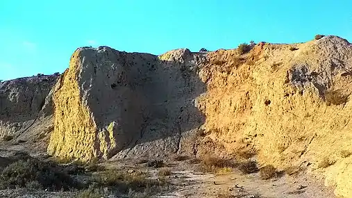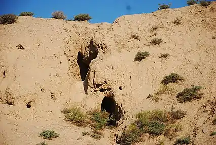 تعداد بسیار زیادی از این چالهها در قسمتهای جنوبی و شرق آن ایجاد گردیدهاند. تسطیح و خاکبرداریهای صورت گرفته در محوطه باعث پدید آمدن شیبها و دیوارهای عمود و برشهای صافی در تپه شدهاست. همانطور که پیش از این نیز آمد، در نتیجه حفاریها و خاکبرداریهای غیرمجاز در قسمتهای مرکزی و شمالی برجستگی جنوبی آثار و بقایای معماری و ساختارهای خشتی نمایان شدهاست. در میان حجم بسیار زیاد تخریبهای صورت گرفته، قطعات مختلف سفالهای گوناگون دیده میشود، پراکندگی و حجم بسیار زیاد این بقایا تا حد زیادی نشان دهنده اهمیت محوطه و وسعت تخریبات صورت گرفته در آن است.[9]