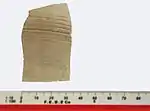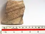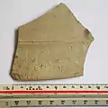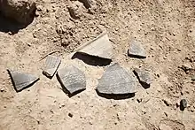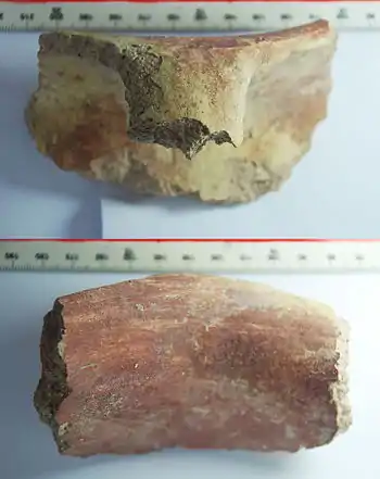 علاوه بر این قطعات، قطعهای از یک ظرف سبو مانند با بدنه کروی و خمیرهای به رنگ قهوهای روشن به دست آمد، شاموت این ظرف را شن متراکم و ذرات آهک تشکیل میدهد، سطح این سفال را پوشش گلی به رنگ قهوهای بسیار روشن دربر گرفته، این سفال چرخ ساز است و در حرارت نامناسب پخته شدهاست، سطح آن ساده و غیر منقوش است. علاوه بر این قطعه، قطعهای از یک ظرف نسبتاً خشن با ضخامتی در حدود یک سانتیمتر به دست آمد. خمیره این سفال به رنگ نخودی متمایل به نارنجی با شاموت فراوان ماسه است. سطح بیرونی این قطعه را پوشش گلی غلیظی به رنگ نخودی متمایل به کرم دربر گرفتهاست.