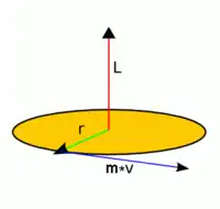 وابستگی تکانهٔ زاویهای به سرعت، جرم و توزیع جرم (موقعیت ذره نسبت به نقطهٔ مرجع) در رابطهٔ بالا مشهود است. بنا به تعریف، ضرب خارجی دو بردار شبه برداری است که بر هر دو بردار اصلی عمود است. پس، بردار تکانهٔ زاویهای بر صفحهٔ دوران ذره عمود خواهد بود (شکل روبرو).
