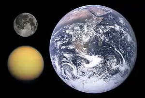 تایتان (به فرانسوی: Titan)، یا تیتان، بزرگترین قمر سیارهٔ کیوان (زحل) است که در فاصلهٔ ۱٫۲ میلیارد کیلومتری از خورشید واقع شدهاست. تیتان بزرگترین قمر زحل دارای متراکمترین هواکره (اتمسفر) در منظومهٔ خورشیدی است که شواهد پایدار از مایعات سطحی نیز در آن یافت شدهاست.[10] تیتان بسیار کندتر از زمین به دور خود میچرخد، به طوری که یک روز تیتان در حدود ۱۶ روز زمین است.[11] تیتان از نظر میزان جرم، یازدهمین جسم پرجرم در منظومهٔ خورشیدی است.