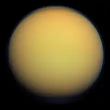 ![]() تیتان در سال ۲۰۱۲ که با رنگ طبیعی به تصویر کشیده شدهاست. جو غلیظ به دلیل مه غلیظ ترکیبهای ارگانونیتروژنی نارنجی است. | |