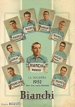 | ۱۸۹۹–۱۹۰۰ ۱۹۰۵–۱۹۰۸ ۱۹۰۹ ۱۹۱۰–۱۹۱۳ ۱۹۱۴ ۱۹۱۵–۱۹۱۸ ۱۹۱۹–۱۹۲۰ ۱۹۲۱ ۱۹۲۲ ۱۹۲۳–۱۹۲۶ ۱۹۲۷–۱۹۲۸ ۱۹۲۸ ۱۹۲۹–۱۹۳۲ ۱۹۳۳–۱۹۴۸ ۱۹۴۹–۱۹۵۰ ۱۹۵۱–۱۹۵۹ ۱۹۶۰–۱۹۶۴ ۱۹۶۵–۱۹۶۶ ۱۹۷۳–۱۹۷۷ ۱۹۷۸–۱۹۷۹ ۱۹۸۰–۱۹۸۴ ۱۹۸۵–۱۹۸۶ ۱۹۸۷–۱۹۸۹ ۱۹۹۳ ۲۰۰۳ | Bianchi Bianchi Bianchi–Pirelli Bianchi Bianchi–Dei Bianchi Bianchi–Pirelli Bianchi–Dunlop Bianchi–Salga Bianchi Bianchi–Pirelli Mirandola–Bianchi–Pirelli Bianchi–Pirelli Bianchi Bianchi–Ursus Bianchi–Pirelli Bianchi Bianchi–Mobylette Bianchi–Campagnolo Bianchi–Faema Bianchi–Piaggio Sammontana–Bianchi Gewiss–Bianchi Bianchi–Freetime Team Bianchi | |