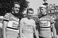![]() Saint-Raphaël–Helyett–Hutchinson riders Albertus Geldermans، ژاک آنکتیل و Michel Stolker در تور دو فرانس ۱۹۶۲ | |