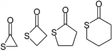 ۵ تیولاکتون ساده به ترکیب (از چپ به راست) آلفا-، بتا-، گاما- و دلتا-تیولاکتون