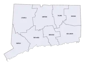 نقشه همه مختصات با استفاده از گوگل مپ استخراج شده. مقادیر تقریبی براساس شهرستانهای کنتیکت است. شمارش اماکن بر اساس دادههایی است که در پایگاه اطلاعات ثبت نام ملی در تاریخ ۲۴ آوریل ۲۰۰۸ به ثبت رسیدهاست؛ و فهرستهای اماکن تاریخی جدید به صورت هفتگی پس از آن در سایت ثبت نام ملی از مکانهای تاریخی وارد شدهاست.