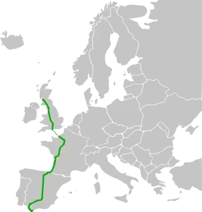 این جاده که از شهر گرینوک (بریتانیا) شروع شده در شهر آلخدیراس (اسپانیا) به پایان میرسد و ۲۹۲۴ کیلومتر مسافت دارد.