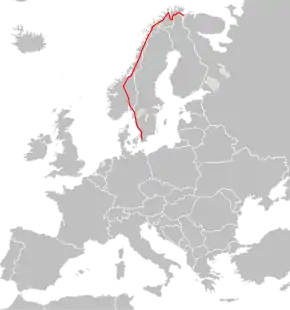 این جاده که از شهر ترلبورگ (سوئد) شروع شده در شهر کیرکنس (نروژ) به پایان میرسد و ۳۱۴۰ کیلومتر مسافت دارد.