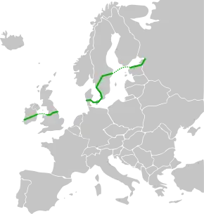 این جاده که از فرودگاه شنن (ایرلند) شروع شده، در شهر سن پترزبورگ (روسیه) به پایان میرسد و ۱۸۸۰ کیلومتر مسافت دارد.