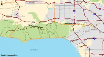 ![]() نقشهٔ جادهٔ مالهالند (نارنجی) و بزرگراه مالهالند (قهوهای) در شهرستان لسآنجلس | |