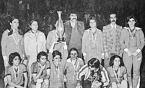 ایرانا قهرمان نخستین جام قهرمانی بسکتبال بانوان ایران، اولین جام شهبانو در دستان نینا زرگر صالح کاپیتان باشگاه ایرانا، (دیماه ۱۳۵۴).