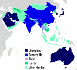 گر چه تیم ملی ایران تا ۱۹۹۶ صاحب این عنوان بود ولی در این سال عربستان و در سال ۲۰۰۴ ژاپن با سه قهرمانی به رکورد ایران رسیدند. از سال ۲۰۱۱ تاکنون نیز ژاپن با چهار قهرمانی (۱۹۹۲، ۲۰۰۰، ۲۰۰۴، ۲۰۱۱) پرافتخارترین تیم آسیا است.