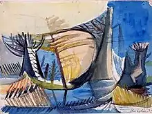 جان مولویل، چشمانداز (۱۹۳۷)، آبرنگ و گچ بر روی کاغذ