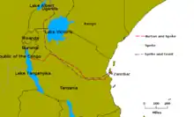 مسیرهای طی شده توسط برتون و اسپک (۱۸۵۷-۱۸۵۸) و اسپک و گرنت (۱۸۶۳).