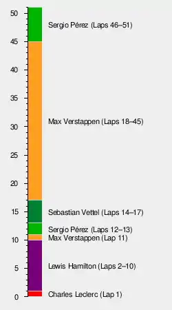 در اخرین دور های مسابقه لاستیک رهبر مسابقه یعنی مکس ورستاپن می ترکد. کریستیان هورنر رئیس تیم ردبول اعلام می کند به نظر مشکل لاستیک مکس با استون مارتین یکی بوده است. پرچم قرمز بر افراشته می شود و فیا اعلام می کند که در ساعت ۱۸:۱۰ به وقت محلی مسابقه از سر گرفته خواهد شد.
