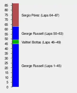 جورج راسل در حالی که میخواست اول شود، پنچر کرد و هفتم درآمد. بعد تیم مرسدس متوجه شد اشتباهی لاستیکهای والتری بوتاس را گذاشته و جورج راسل دوباره به پیت لین آمد. در آخر جورج راسل نهم درآمد و سریعترین دور را هم گرفت.