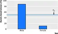 نتیجهٔ پژوهش مجلهٔ پزشکی بریتانیا در سال ۲۰۱۴ میلادی که بر روی برندگان بیست سالِ این جایزه انجام شده بود نشان داد که حدود ۹۰ درصد برندگان آن مرد بودهاند. از ۳۳۲ نفر برندهٔ جایزهٔ داروین در میان سالهای ۱۹۹۵ تا ۲۰۱۴، ۱۴ نفر به دلیل مشخص نبودن جنسیتشان کنار گذاشته شدند و از ۳۱۸ نفر باقیمانده، ۲۸۲ نفرشان مرد (۸۸٫۷٪) و ۳۶ نفرشان زن بودند.[5]