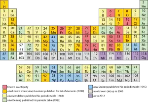 جدول تناوبی با نام دیمیتری مندلیف شناخته شدهاست، با اینکه پیشروان دیگری پیش از او وجود داشتهاند. او این جدول را در سال ۱۸۶۹ منتشر کرد. این، نخستین جدولی بود که به این گستردگی مرتب شده بود. مندلیف این جدول را تهیه کرد تا ویژگیهای دورهای آنچه که بعدها «عنصر» نام گرفت را بهتر نشان دهد. وی توانسته بود برخی ویژگیهای عنصرهایی که هنوز کشف نشده بود را پیشبینی کند و جای آنها را خالی گذاشته بود.[1] کمکم با پیشرفت دانش، عنصرهای تازهای شناسایی شد و جای خالی عنصرها در جدول پُر شد. با شناسایی عنصرهای نو و گسترش شبیهسازیهای نظری دربارهٔ رفتار شیمیایی مواد، جدول آن روز مندلیف بسیار گستردهتر شدهاست.